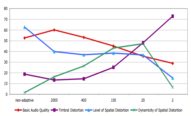 However, the adaptive KLT process introduced some other artefacts, which are related to the adaptation rate. When the adaptation rate was relatively slow, dynamic spatial distortion was perceived in the form of moving image and sources. When the adaptation rate was very high, timbral distortions were predominant, see Figure 3.