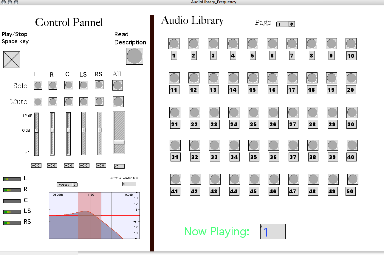 Number of 5.1 channel audio excerpts were recorded and looped. An interface of was developed allowing for instantaneous access to these excerpts (see figure below). This interface also allows users to mute or solo certain channels. Thus it is possible to make AB comparisons between different items to find out a "short list" of "critical" material. Filters can be applied at run time.