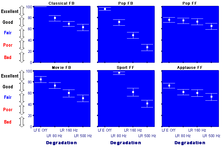 Figure 2 shows the effect of switching off the LFE channel in conjunction with high-pass filtration of all channels. Effects of switching off the LFE channel without any filtration of the main channels are also presented in this figure in order to compare the magnitude of the effect for these two types of degradation. Switching off the LFE channel combined with high-pass filtration of the main channels degraded the audio quality considerably. For all items shift of the lower boundary of the bandwidth up to 500 Hz and switching off the LFE channel degraded the audio quality to "Poor" (20-40). Obtained results show that simultaneous reduction of low frequencies in all channels considerably degrades audio quality. A similar result was obtained for the front left and right channels (Fig. 3). High-pass filtration of front left and right channels in conjunction with switching off the LFE channels caused also substantial degradation of audio quality, however a bit smaller than in the previous case. Moreover, for some items (Pop F-F and Applause F-F) band-limitation of left and right channels caused small deterioration of quality in relation to degradation of quality due to switching off the LFE channel. It can be explained by the fact that loss of LF content in left and right channels was not so noticeable because of the pronounced LF components in remaining channels.