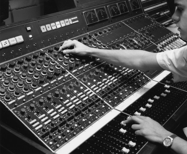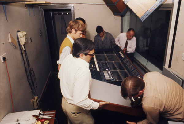 A later picture of the Neve in use, after it had been expanded to 16 channels (note that the EQ modules in the first 4 channels are different)