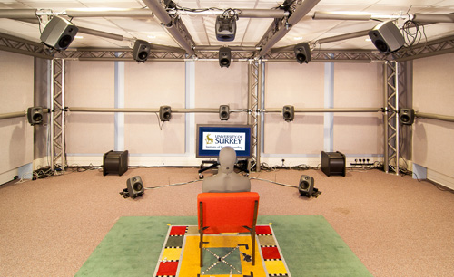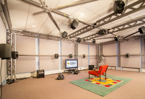 The ITU-R standard is the most critical international standard for listening rooms, with strict criteria for low noise, controlled reflections, dimension ratios and reverberation time. The Surrey listening room is air conditioned to provide a comfortable working environment and is equipped with a flexible range of reproduction systems from stereo to multichannel including elevated loudspeakers. This enables listening tests on multichannel surround sound to be carried out effectively.