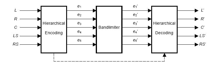 Moreover, it is proposed to develop a method for "graceful" bandlimitation of surround sound, that it to say, the bandlimitation causing minimal losses in audio quality. In this method original surround sound signals will be decomposed to a set of independent audio components which are ordered "hierarchically" according to their order of importance. Under the restricted transmission conditions, the overall bandwidth of surround sound is "squeezed" to fit the available bandwidth by extremely limiting the bandwidth of the least important audio components. The proposed method is called "Hierarchical Bandlimitation" which is depicted in the following figure.