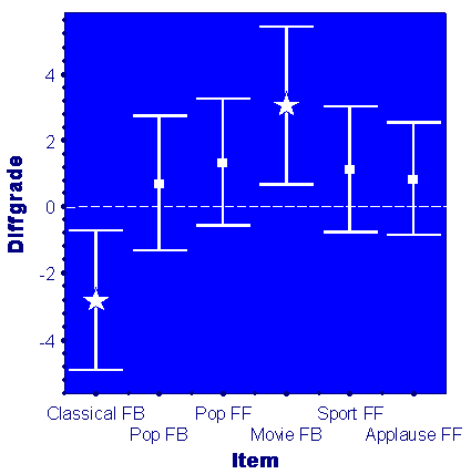 Fig. 1 Differences between basic audio quality scores obtained with picture presence and without picture for different programme material. Asterisk denotes that means are significantly different from zeroThere was no global effect of video presence on grading of audio quality, however small but statistically significant interaction between audio and visual modalities was detected for two items. Figure 1 shows differences between scores obtained during audio-visual presentation and audio-only presentation. Positive mean values show improvement of audio quality due to video interaction whereas negative values indicate deterioration of audio quality caused by video presence (zero represents no audio-visual interaction). For organ music (Classical F-B) the scores given during audio-visual presentations were lower than scores given during audio-only presentation (mean value less than zero). It was probably caused by "boring" video content (static pictures). The opposite interaction was observed for Movie F-B. In that case video presence "improved" the grading of the audio quality. It may be explained by interesting and involving content of the video presentation, which "positively" affected grading of the audio quality. In both cases video presence "shifted" the scores up to 3 % only, which shows that mentioned effect is small, however statistically significant. This observation is in line with results obtained Beerends et. al. (1999). It was also found that some of the listeners are more susceptible to video influence than others. For example, subjects No. 3, 7 and 13 had tendency to grade audio quality slightly "better" for audio-visual presentation than for audio-only one (Fig. 2). In general, obtained results showed that video presence had a small (but statistically significant) effect on audio scores.